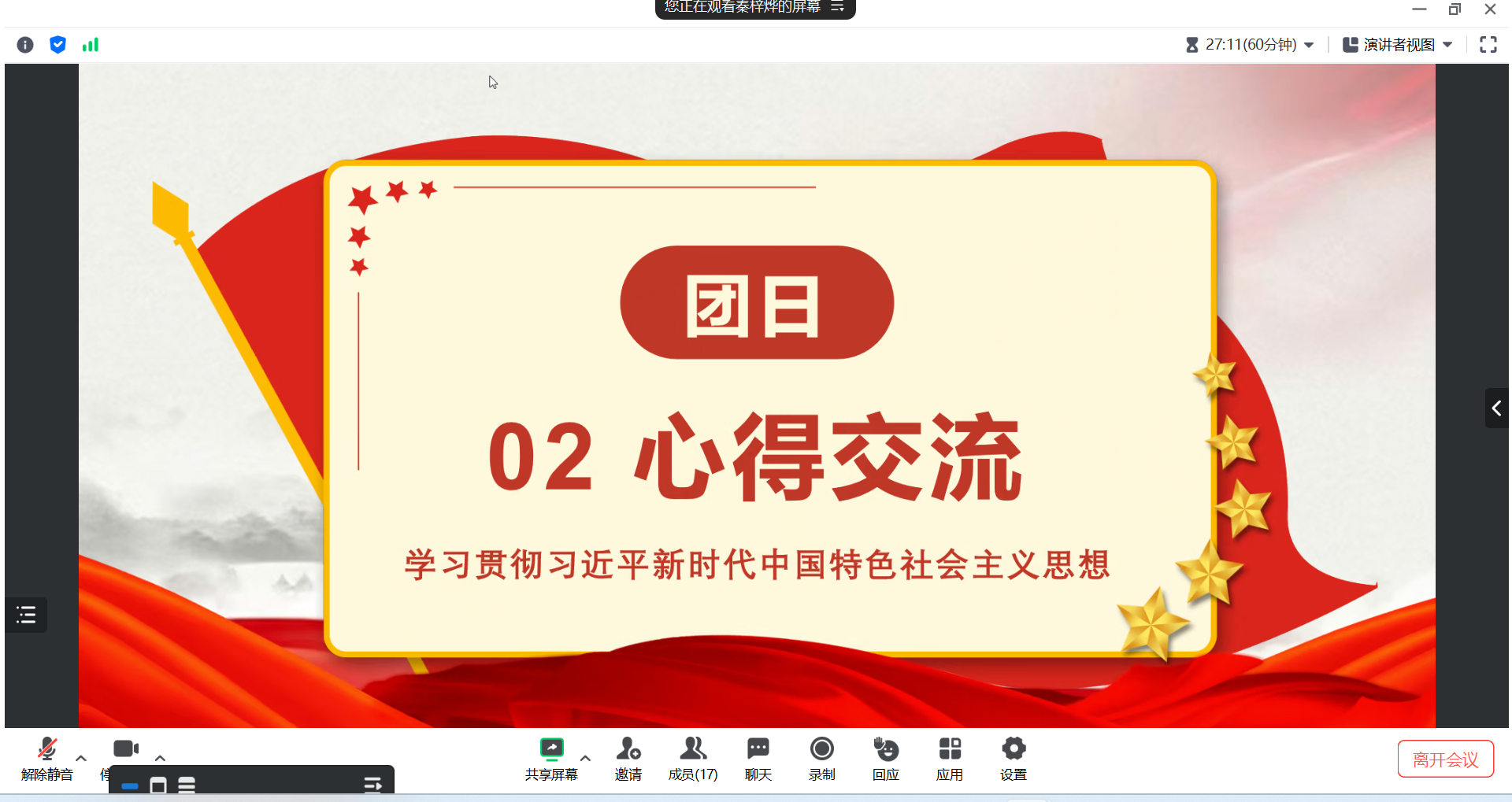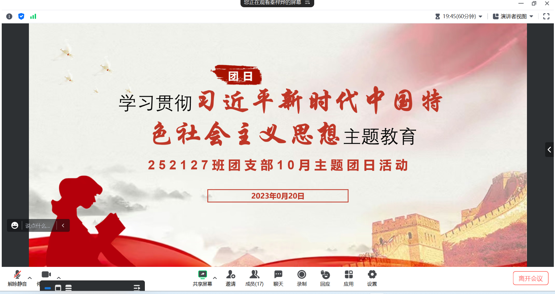 虽然线上会议时间有限,同学们不能一同阅读更多文章,但思想上的启迪会激励同学们不断学习进步。道阻且长,行则将至。相信在会议结束后的日常活动中,支部也将定期分享时事政治内容到班级群并鼓励同学们自行阅读,交流感悟;相信本次团日活动结束后,同学们也会继续保持对党和国家的热爱,自觉学习贯彻习近平新时代中国特色社会主义思想,以青春之光点亮未来,以理想之力共写新篇,为党和国家的建设事业踔厉奋发,勇毅前行!