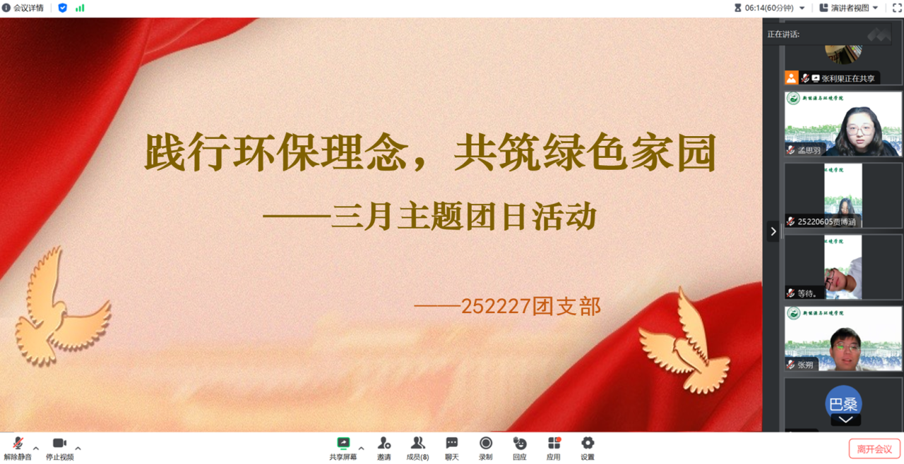 252325团支部安排了绿色环保知识问答环节。在环保知识的问答环节中,同学们通过思考和交流,围绕日常生活践行绿色环保理念展开讨论“拒绝“伪环保”:不因“拍照打卡”而浪费资源,不盲目购买“环保产品”制造新消费;保持“学习心”:关注环保新闻,了解“碳足迹”计算,用科学方法优化生活方式。