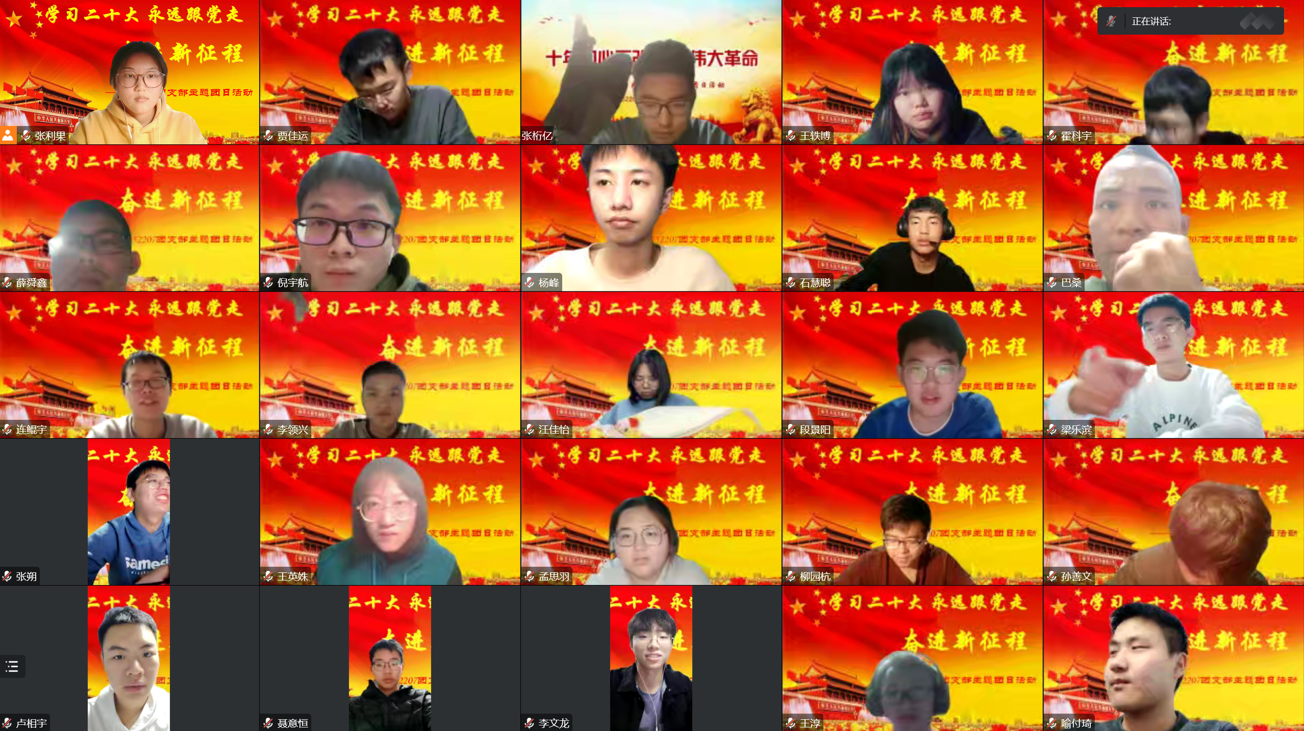 云团课结束后,团支书张利果于晚八点半在腾讯会议上召开云团课的体会分享会议,组织同学们有序进行心得交流。会议中,青年团员柳园杭表示“当代青年应该追求远大理想,心中铭刻对马克思主义的崇高信仰、对共产主义和中国特色社会主义的坚定信念,深植家国情怀,传承奋斗担当,不负时代,不负韶华,不负党和人民的殷切希望,勇做走在时代前列的拓荒牛”。随后,青年团员杨峰分享到“作为共青团员的一份子,我们应积极发挥作为党的助手和后备军作用,刚健自信、胸怀天下、担当有为,衷心拥护党的领导,追求远大理想,锻炼强健体魄,矢志不渝跟党走”。