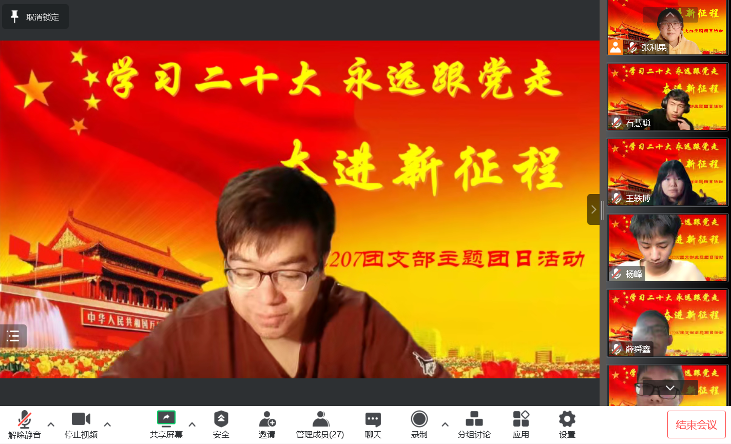为全面贯彻习总书记对新时代中国青年的殷切希望,健康引导广老员工深入了解党的二十大精神、增强“四个意识”、坚定“四个自信”,矢志不渝跟党走,主动担负起时代与国家赋予的使命,304永利集团252207班团支部于11月26日晚七点在团支书张利果的带领下开展“学习二十大 永远跟党走 奋进新征程”暨青年大学习感悟交流会主题团日活动。此次活动共有包括团支部内24名共青团员在内的27位青年参加。