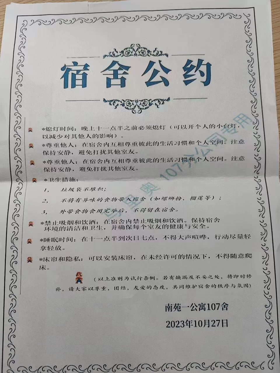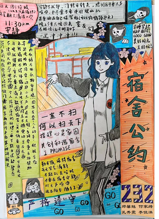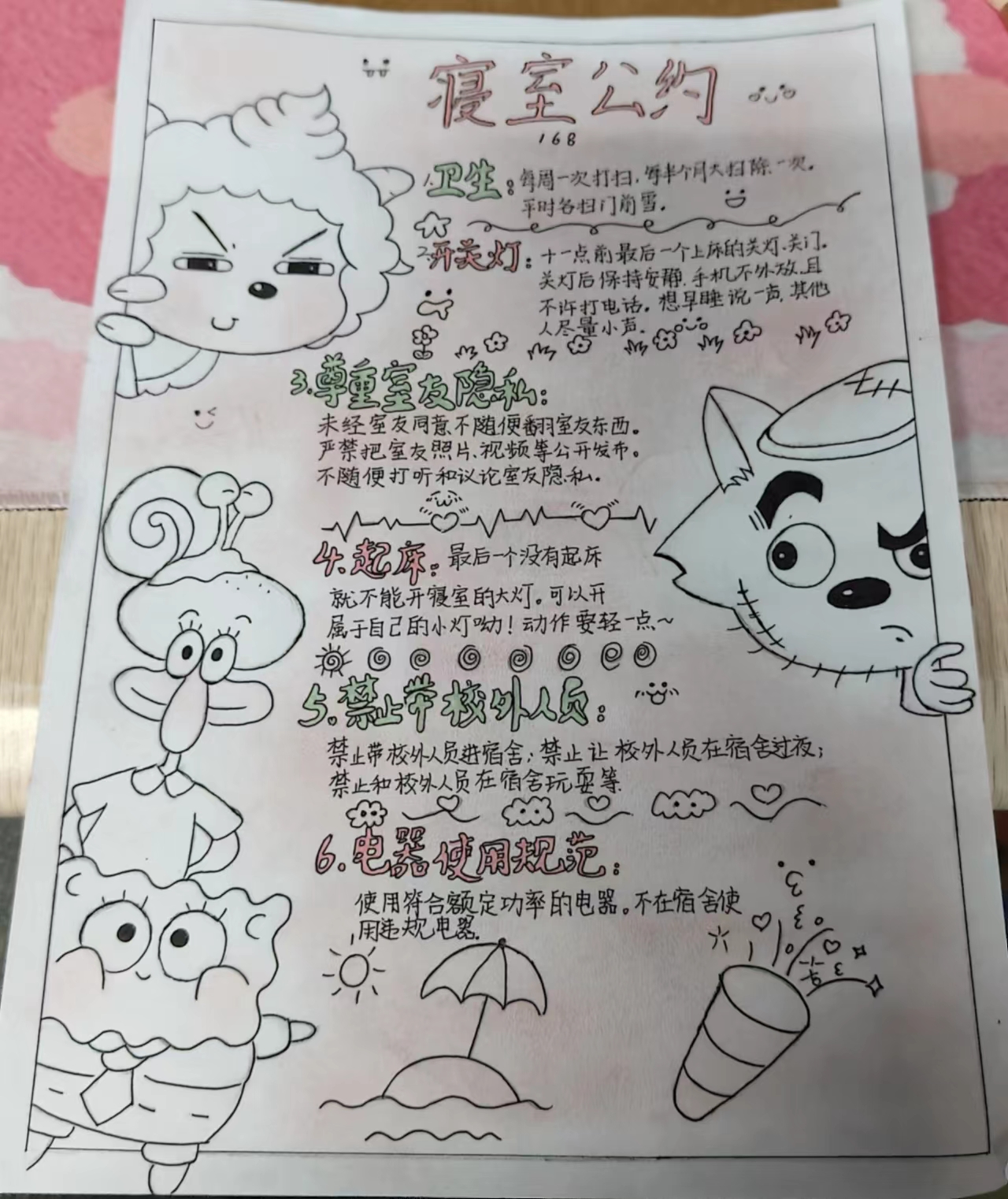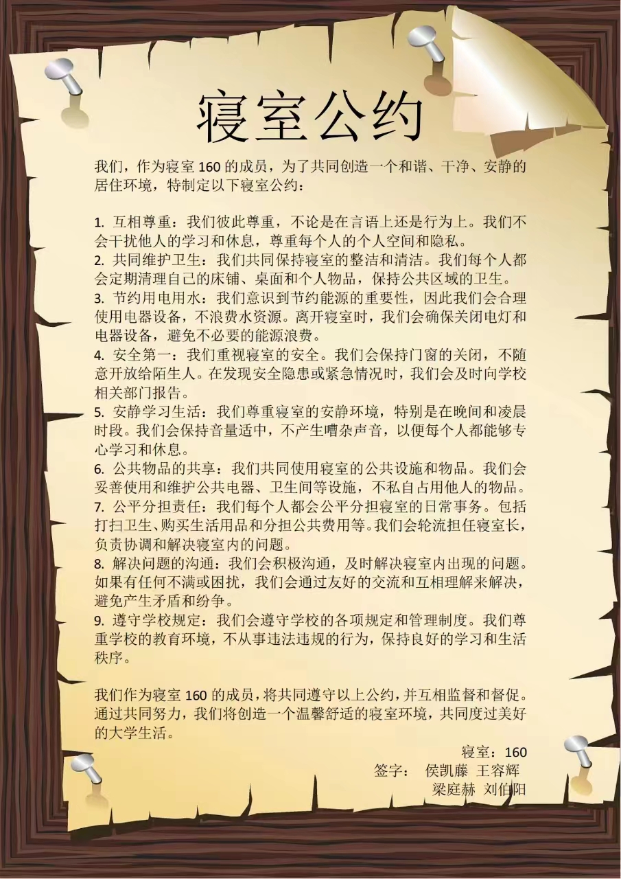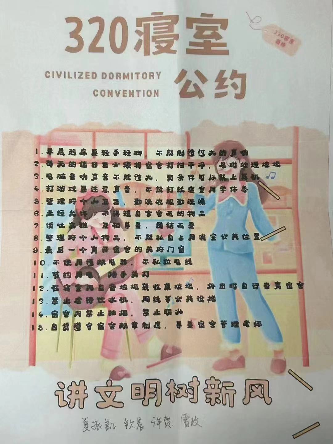 为进一步加强公寓文化建设,发挥公寓育人阵地作用,推动员工寝室制度化、有序化管理,引导员工养成良好的生活习惯,营造文明和谐、干净整洁的寝室文化氛围,304永利集团面向全体2023级本科生举办寝室公约创建活动,以多种多样的形式围绕宿舍卫生、校规校纪、学习氛围、作息时间等方面进行设计,涌现出一大批优秀的寝室公约。(以下排名不分先后)