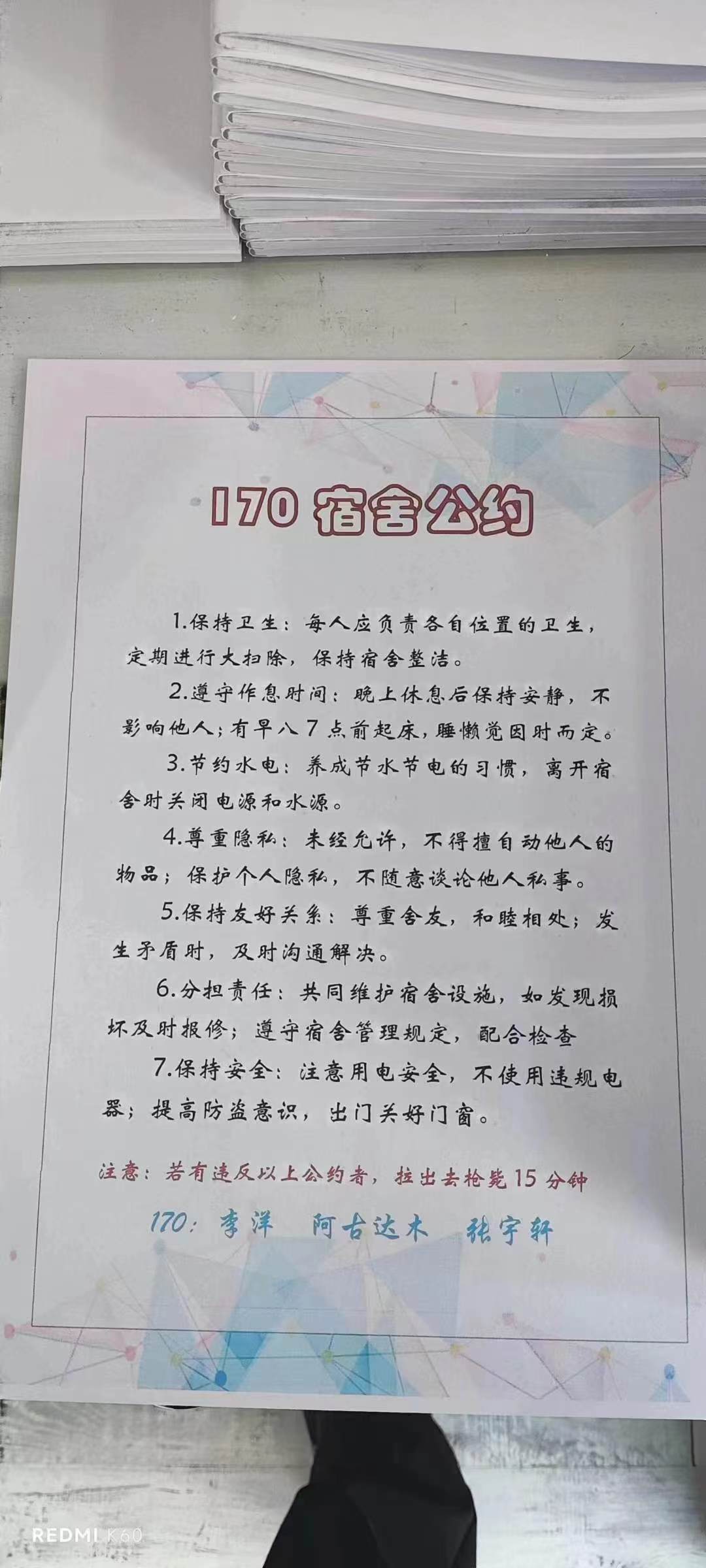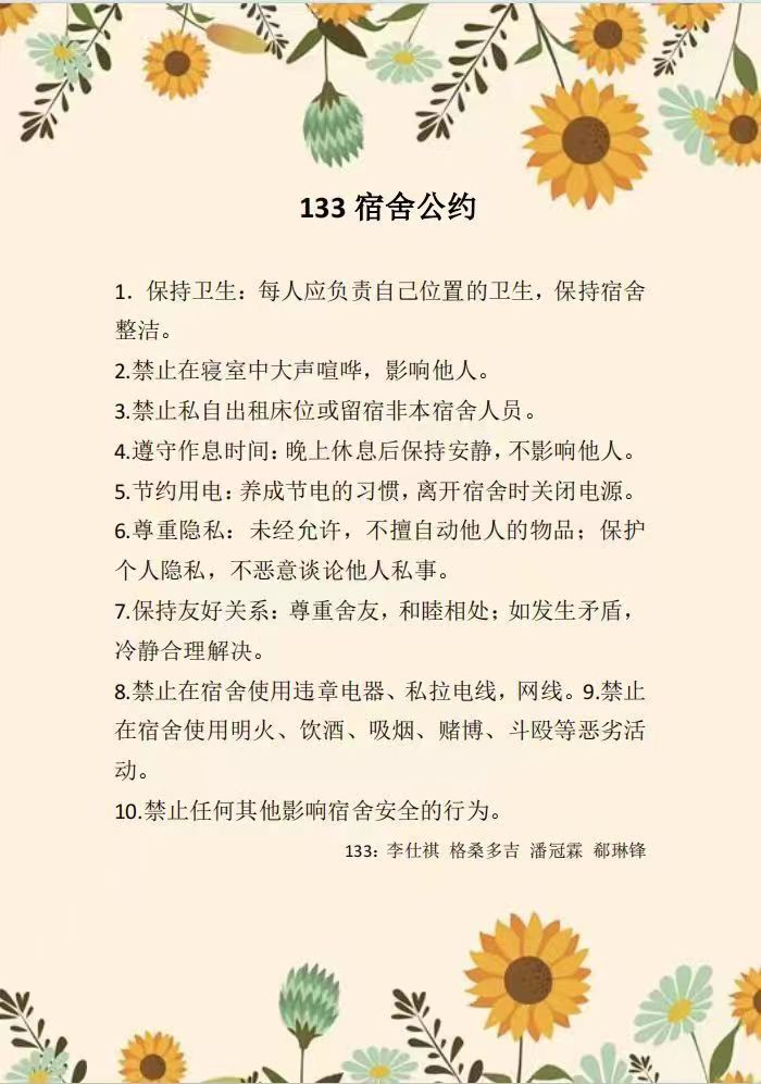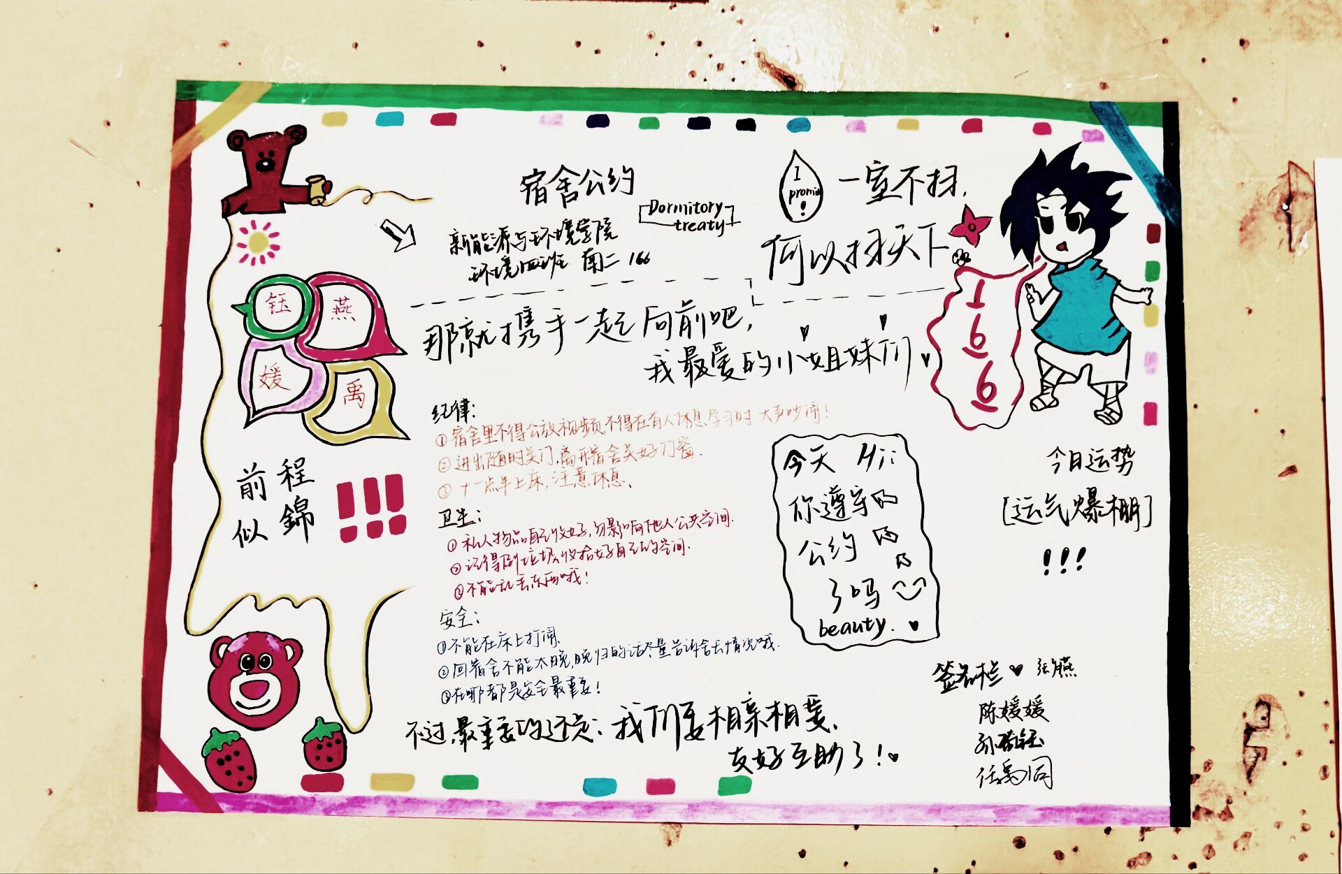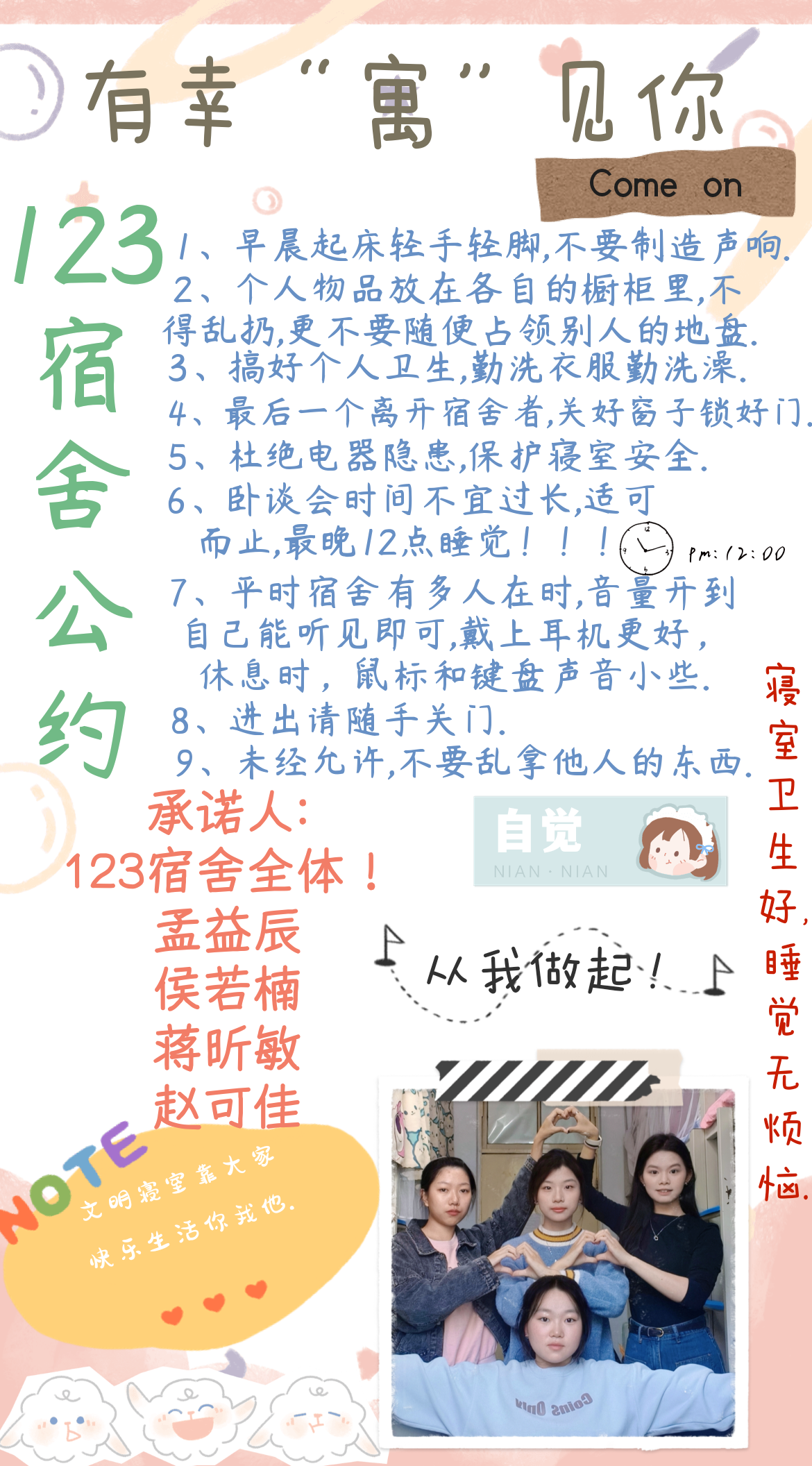 为进一步加强公寓文化建设,发挥公寓育人阵地作用,推动员工寝室制度化、有序化管理,引导员工养成良好的生活习惯,营造文明和谐、干净整洁的寝室文化氛围,304永利集团面向全体2023级本科生举办寝室公约创建活动,以多种多样的形式围绕宿舍卫生、校规校纪、学习氛围、作息时间等方面进行设计,涌现出一大批优秀的寝室公约。(以下排名不分先后)