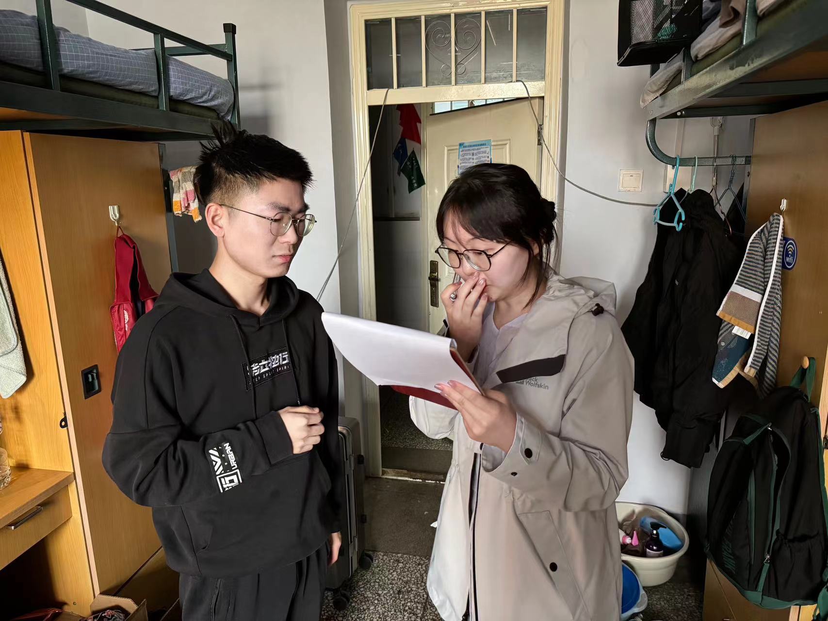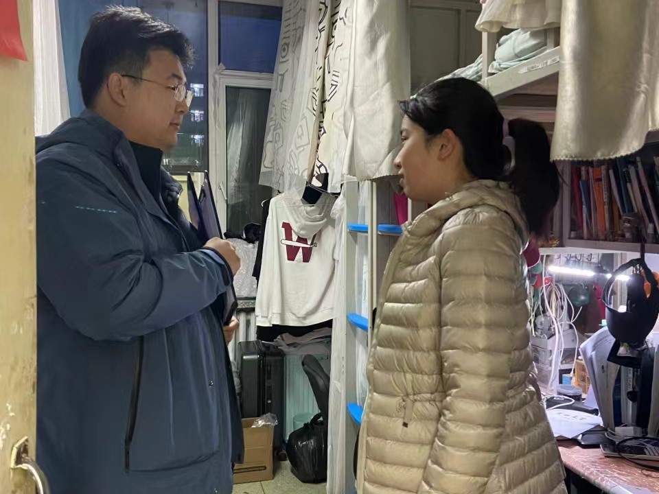 4月12日,2020级辅导员霍美汐老师对304永利集团朝阳校区五公寓、七公寓42间寝室进行检查,提醒同学们注意寝室卫生,了解同学们毕业去向等情况,强调寝室安全。