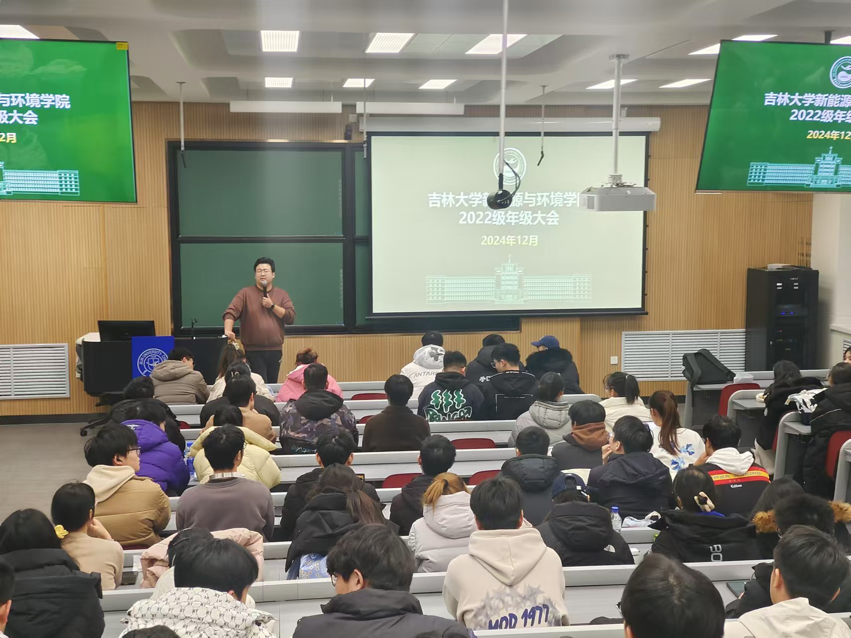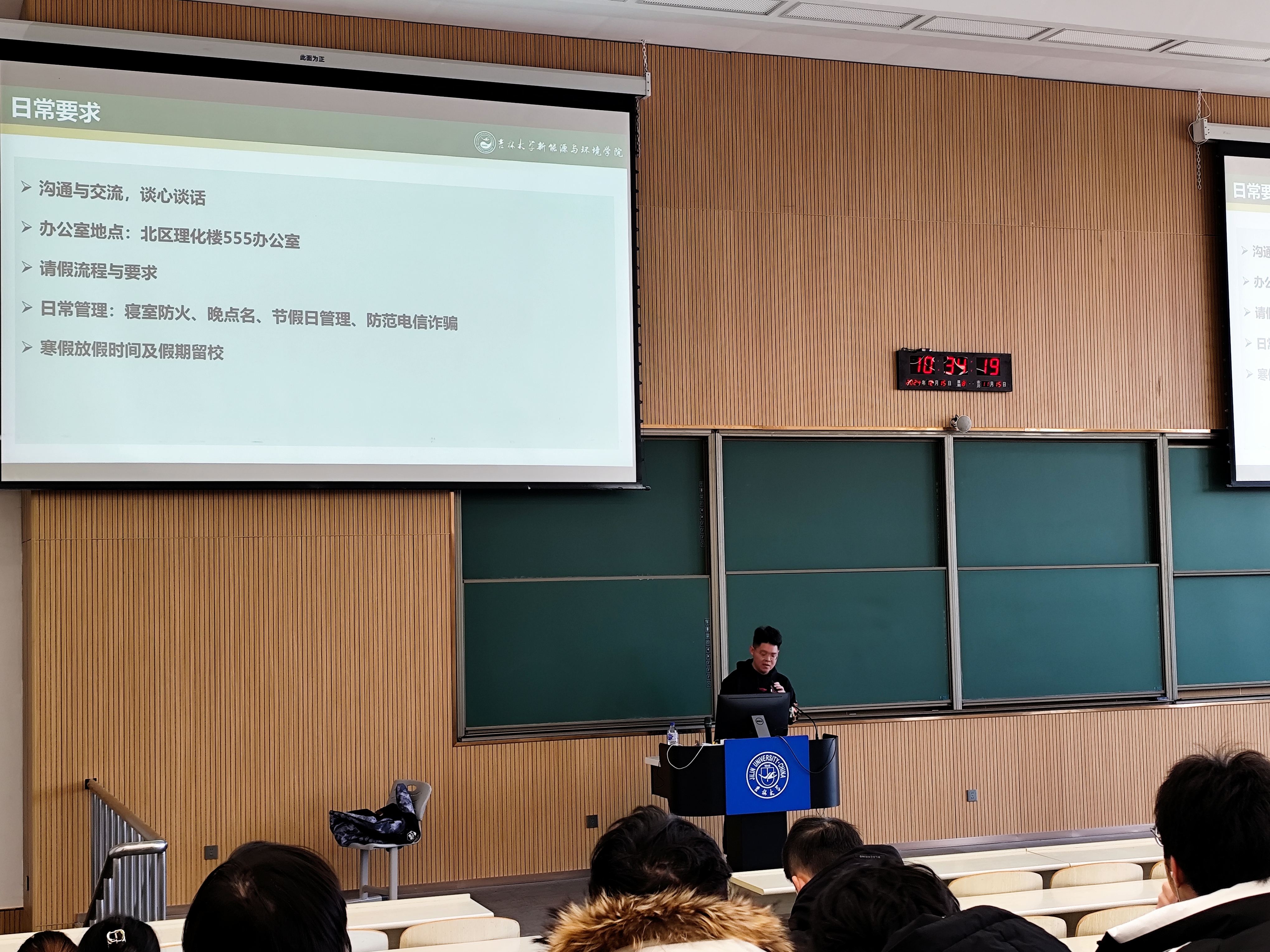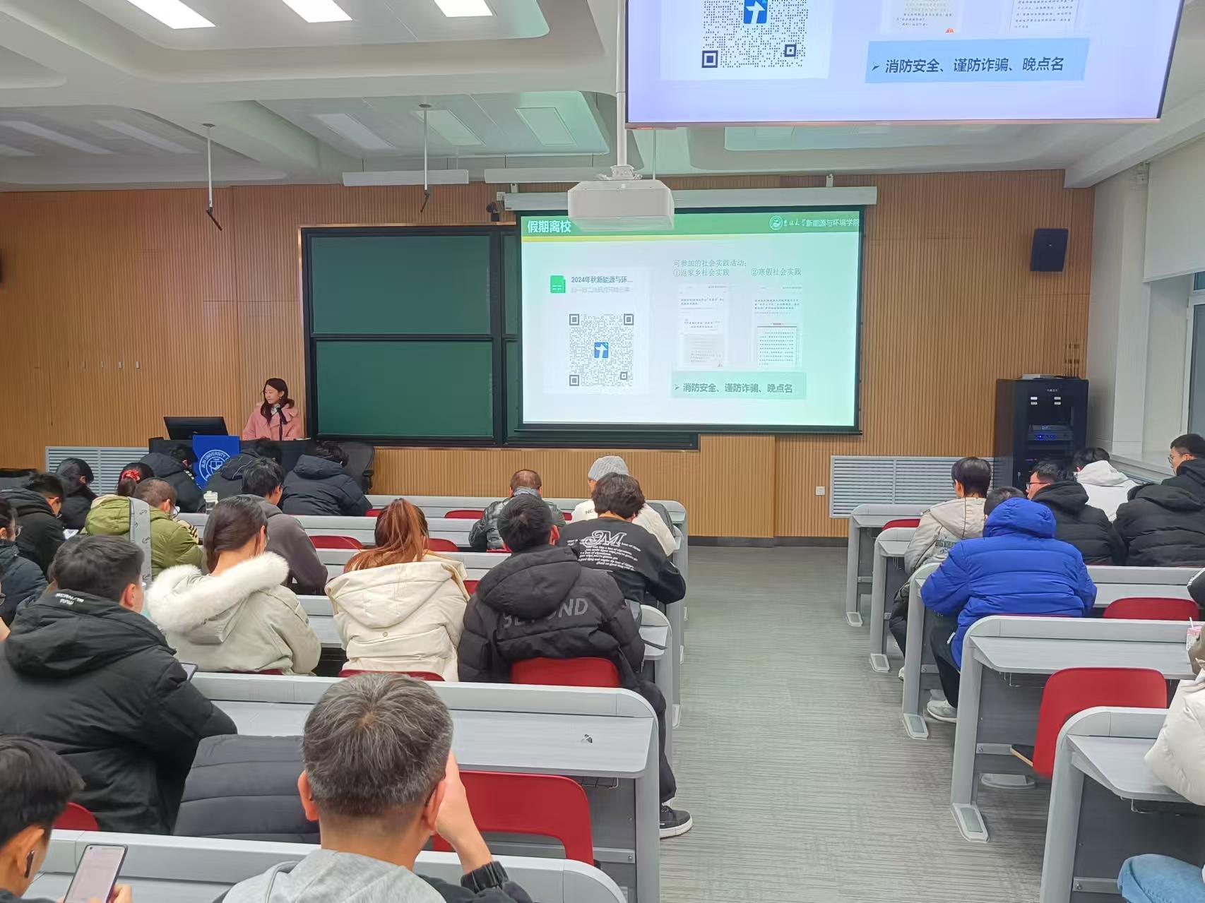 此外,各年级辅导员根据本年级情况进行了专项工作布置。2024级辅导员吴哲老师对民族理论政策和宗教理论进行宣讲,提醒大家及时完成心理慕课期末考试。2023级辅导员姜岳彤老师强调本科员工日常管理要求,鼓励同学们提前对个人职业发展进行规划。2022级辅导员母茂松老师提醒同学们老员工活已经进入后半程,需要尽快确立自己的未来奋斗目标并为之努力。2021级辅导员李薇老师对正在备战考研的同学们进行鼓励,强调考研纪律并预祝大家取得优异成绩。同时,提醒全体同学们关注当前所修学分是否满足毕业标准,课外八学分是否修完,鼓励大家珍惜最后一个寒假,积极参与寒假社会实践活动。