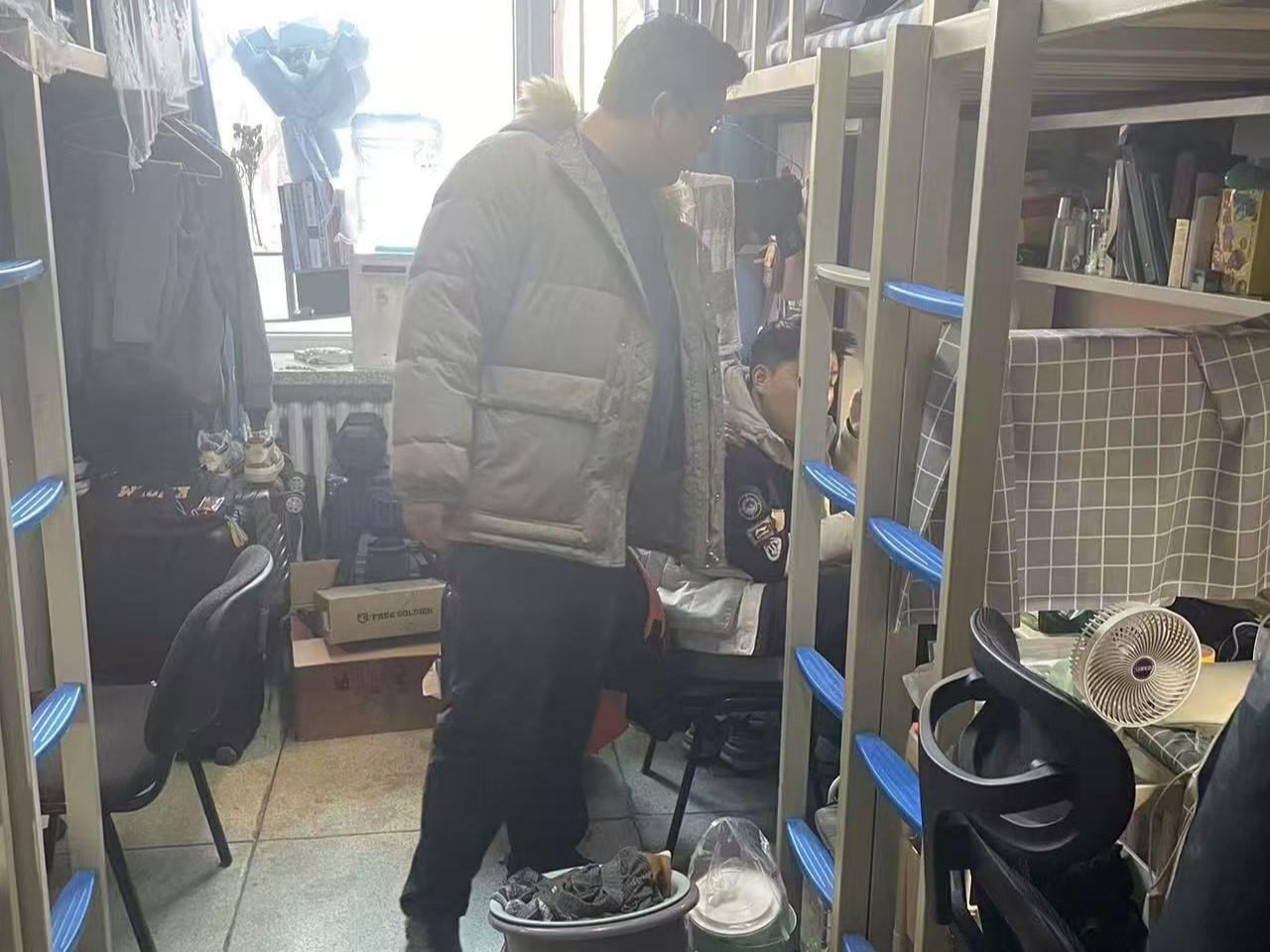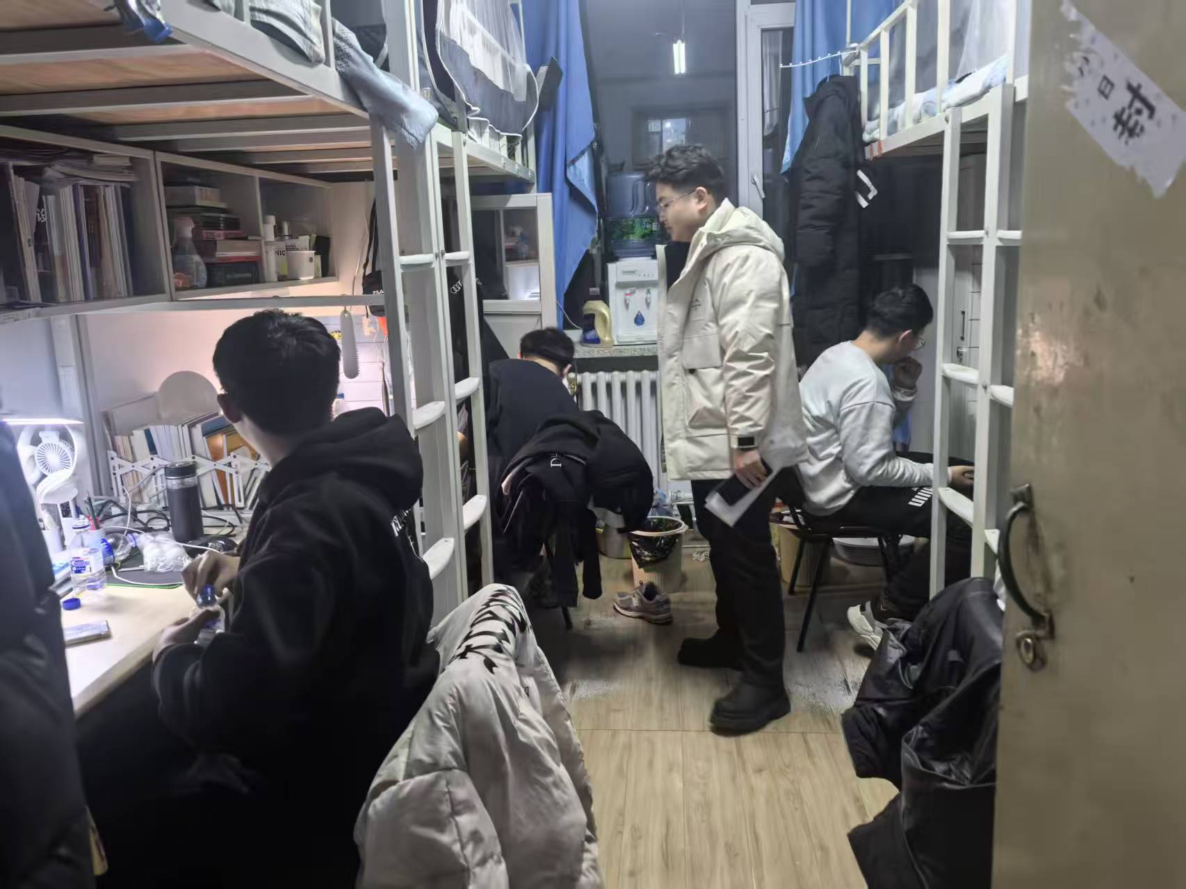 2月24日,2021级辅导员李薇老师进入朝阳五公寓、朝阳七公寓员工对员工考研初试情况进行摸排,对寝室卫生、消防安全进行检查。