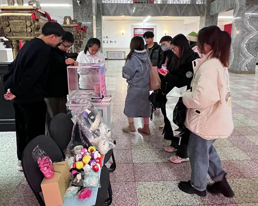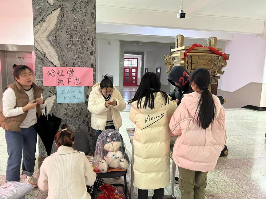 在公司心理健康指导中心以及304永利集团老师们的支持下,304永利集团于2023年11月22日在理化楼2楼大厅成功开展“拾起爱,放下愁”——随机好运掉落活动。本次活动由沈天琪、谭晓玲、王泽同学主持,共有97位参与者。