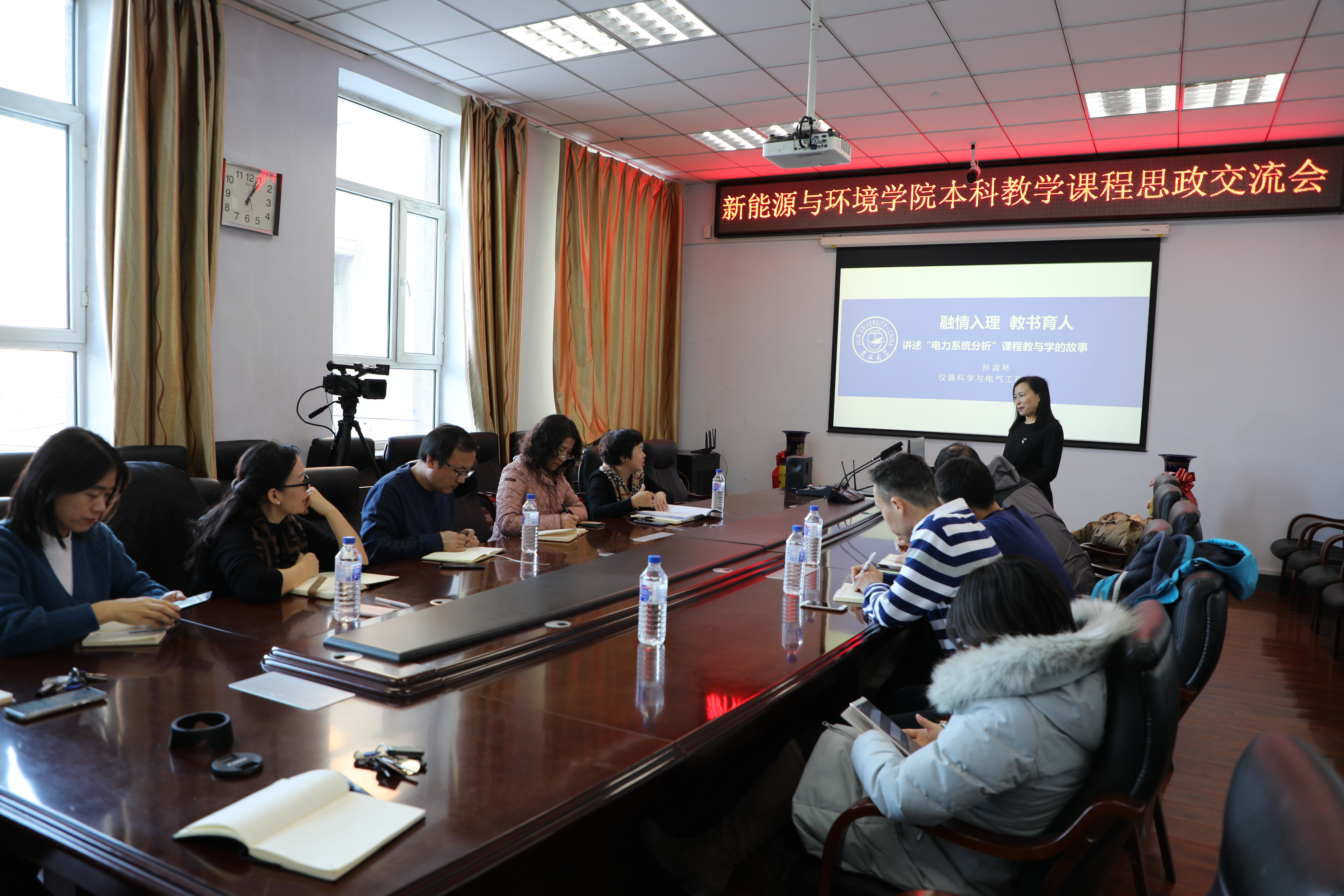 孙老师以《融情于理,教书育人》为题,结合自身成长和所授课程的经历,讲述了关于“电力系统分析”课程中教与学的故事,介绍了专业课融入思政教育的一些方法和技巧。交流会氛围热烈,与会教师积极参与互动。
