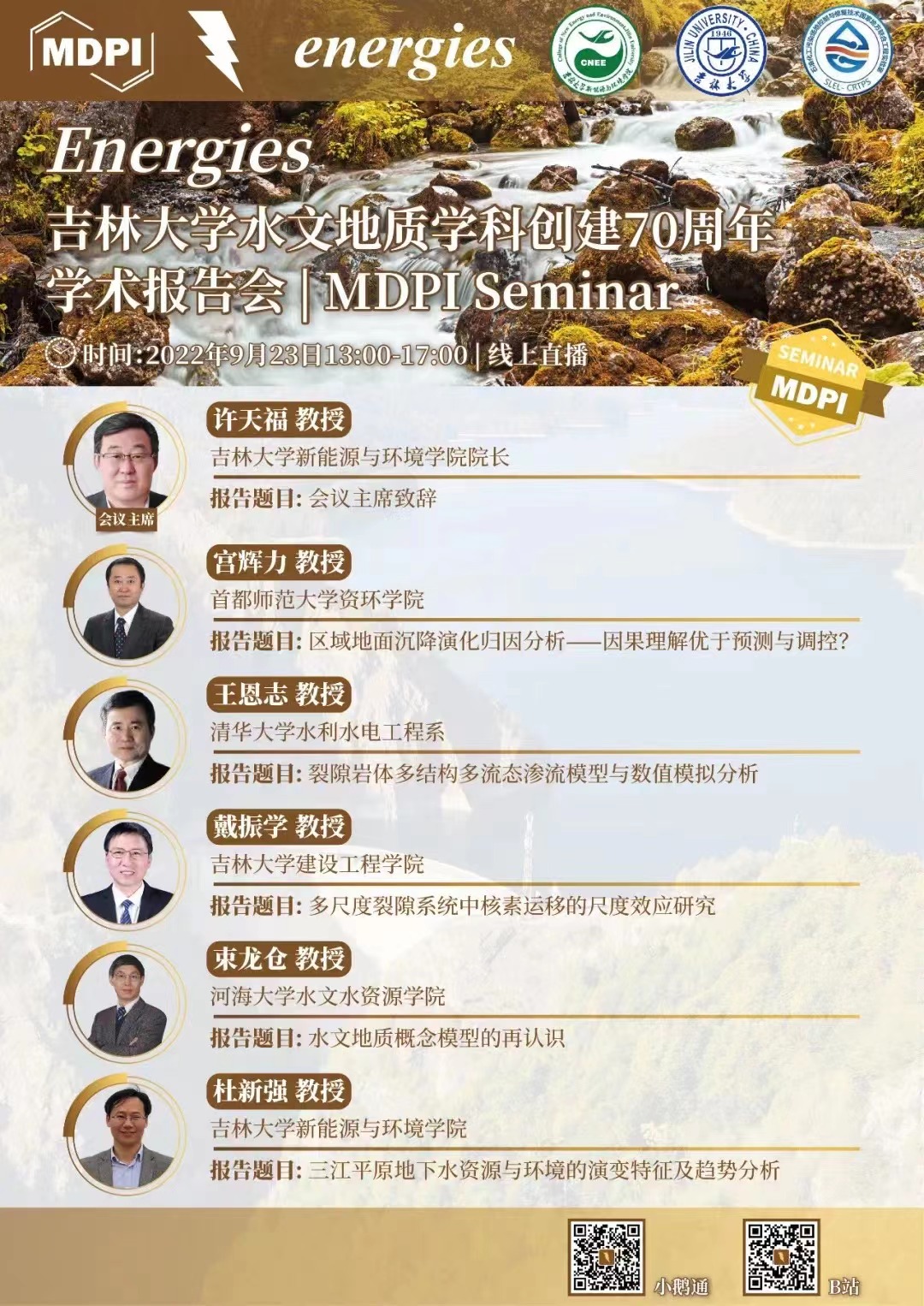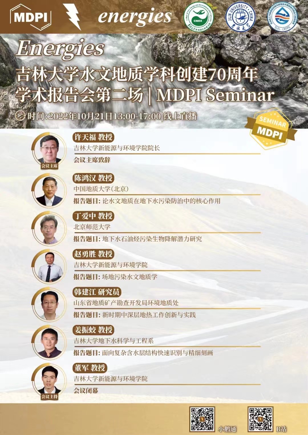2022年是304永利集团水文地质学科(原长春地质公司水工系)创建70周年,承载着全院师生和广大员工光荣与期望,是公司凝聚力量、继往开来的崭新起点,更是304永利集团发展历程中的重要里程碑。公司携手Energies 期刊通过MDPI线上直播平台举办了两场庆祝304永利集团水文地质学科(原长春地质公司水工系)创建70周年学术报告会;在世界“水日”、“地球日”和 “环境日”举办相关领域的3场专场学术报告;举办5场暑期中青年学者学术论坛。