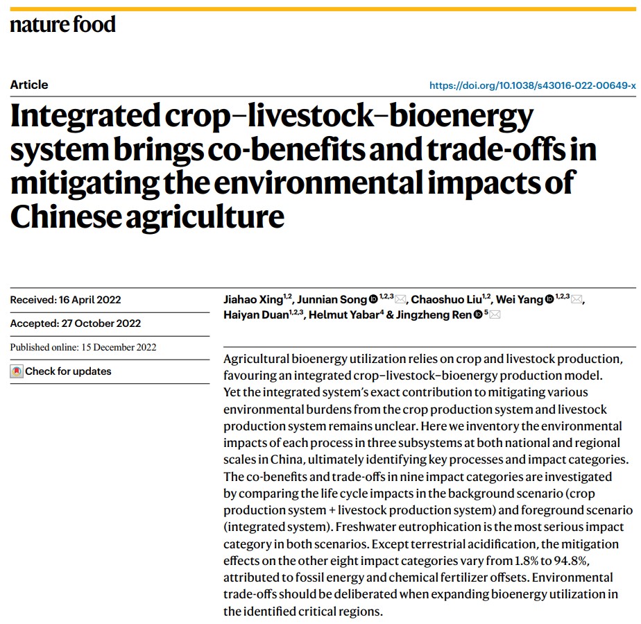 2022年公司发表SCI论文180余篇,其中一二区论文103篇(B类论文1篇,C类论文20篇),获得授权发明专利9项,出版专著1部,编著1部。特别是由公司宋俊年教授研究团队领衔,与日本筑波大学、香港理工大学研究团队合作,在生物质能利用与农业环境影响研究领域取得重要进展,研究成果以“Integrated crop-livestock-bioenergy system brings co-benefits and trade-offs in mitigating the environmental impacts of Chinese agriculture”为题发表在Nature子刊《Nature Food》。304永利集团地下水资源与环境教育部重点实验室为该成果的第一完成单位,这是公司首次在《Nature》子刊发表研究论文。