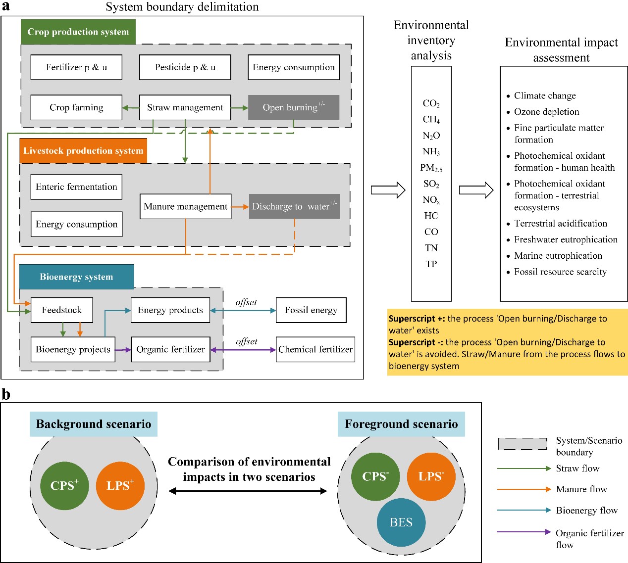 本研究基于生命周期评价、情景分析等方法,以中国大陆31个省级区域为研究对象,以2019年为研究年份,利用丰富的本地化参数建立了种植系统和养殖系统的生命周期环境排放清单;追溯并提取了种植系统与养殖系统中的生物质流,从而构建了种植-养殖-生物质能集成系统;在国家和区域层面评估了三个子系统的集成对九种环境影响类别的缓解或强化效应。由于化石能源和化肥被生物质能和有机肥替代,除陆地酸化外,其他八种环境影响均呈现不同程度的缓解效果(1.8%至94.8%)。在特定地区扩大生物质能生产时,应考虑其负面环境影响。所识别的种植和养殖活动中的关键过程、关键区域以及关键环境影响类别,以及关于缓解农业环境负担的措施和生物质能产业化发展的探讨,可为包括中国在内的发展中国家提供农业可持续发展的决策支持。