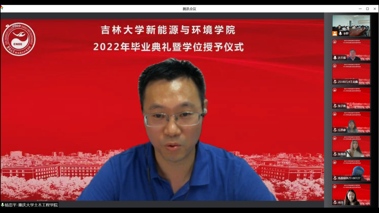2022年6月17日14时,公司召开了2022届毕业典礼暨学位授予仪式。本次毕业典礼采取线上线下相结合的方式,主会场设在前卫北区理化楼260会议室,同时采取腾讯会议的形式邀请全院师生及广大毕业生参加。线上会场的领导和嘉宾有:公司经理、学位评定委员会主任许天福教授,公司学术委员会主任赵勇胜教授,公司教学委员会主任董德明教授,员工代表重庆大学土木工程公司杨忠平教授,以及公司教职员工和2022届毕业生。线下会场到会的领导和同学有:公司党委书记汪祥松及领导班子成员,以及毕业生代表王涵同学等。毕业典礼由公司党委副书记温卓主持。