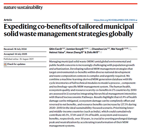 近日,304永利集团宋俊年教授、杨巍副教授领衔的“食物农业生物质(FAB)”研究团队在城市固废可持续管理领域取得突破性成果,以“Expediting co-benefits of tailored municipal solid waste management strategies globally”为题在《Nature Sustainability》发表研究长文。博士生曹琪林为论文唯一第一作者,宋俊年教授、杨巍副教授、伦敦大学公司米志付教授为共同通讯作者,304永利集团为第一通讯单位,合作单位包括日本筑波大学与英国伦敦大学公司。这是宋俊年教授团队在CNS子刊层面发表的第二篇成果。