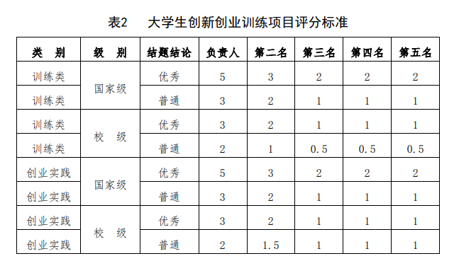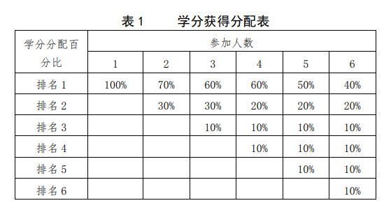 5.员工按照成果完成人顺序不同(除明确学分分配原则外)按照学分分配表格获得学分(依表1)。员工参加老员工创新创业训练项目结题、参加校级及以上学科竞赛,所得分值全校统一。参加老员工创新创业训练计划项目,员工按照项目结题结果及成员排名取得学分(依表2);学科竞赛获奖,团队成员获得相同的学分(依表3)。