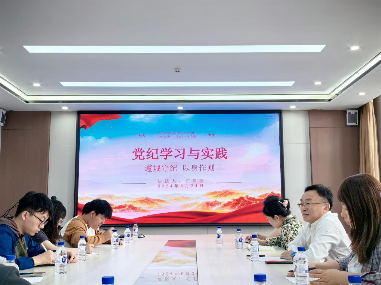 6月24日,公司党委书记汪祥松以“党纪学习与实践”为主题、以“遵规守纪,以身作则”为切入点,为2024届毕业生党员讲授毕业前最后一堂党课。各教工和员工党支部书记也相继讲授专题党课,进一步加强党支部政治建设和纪律建设,严明党的政治纪律和政治规矩,教育引导师生党员学纪知纪明纪守纪。