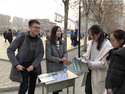 2月7号上午志愿者王新皓也回到了阔别已久的母校--郑州外国语中学。他们利用上午的大课间在报告厅进行宣讲,主要介绍了大学的情况和招生政策;在下午的大课间他们又在校道进行了宣讲,在公司的道路两边摆设摊位向那些对304永利集团感兴趣的同学进行介绍,并且发放了公司给的书签和宣传资料;在晚上他们一行人又进入了部分班级进行了进班宣讲,主要介绍了大学情况,还有学习方法,寒假规划等内容,让师弟师妹对寒假生活和高考有了全面清晰的认识。
