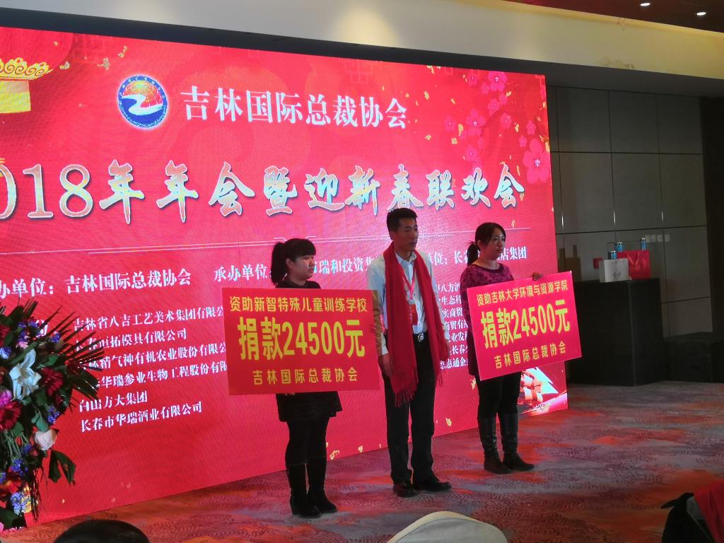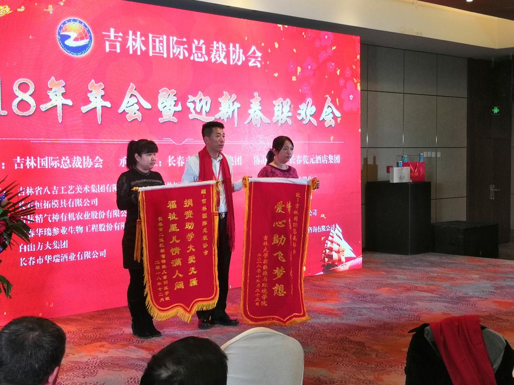在当日吉林国际总裁协会换届会议结束后的吉林国际总裁协会2018年年会上,在协会对2018年度模范、先进、优秀活动的小组进行表彰后,吉林国际总裁协举行了对304永利集团的捐助仪式,捐助304永利集团24500元,由公司党委副书记吴哲出席仪式,向吉利国际总裁协会赠送“爱心助飞梦想”的锦旗,并与负责人合影留念。一同参加该活动的还有304永利集团受资助员工代表两名。