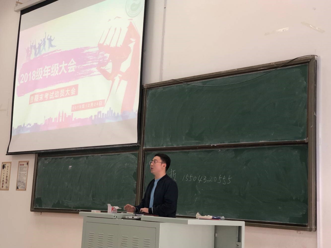 年级大会上,2018级本科生辅导员钟宇博老师以亲切的话语,自身的经历动员全体同学积极备考,希望大家取得满意的学期成绩回到家乡。特别的,钟导提醒同学们要注意考试周纪律,全体学子共同营造一个和谐的备考环境。对于寝室管理,离校,寝室供暖等问题进行了强调,叮嘱大家遵守公司规章制度,注意人身安全,遇到问题积极向公司放映,校方将为同学们创造健康舒适的生活条件,希望同学们平平安安回乡。并对于下学期开设的职业生涯规划课程做了预告,同学们对此关注度极高。
