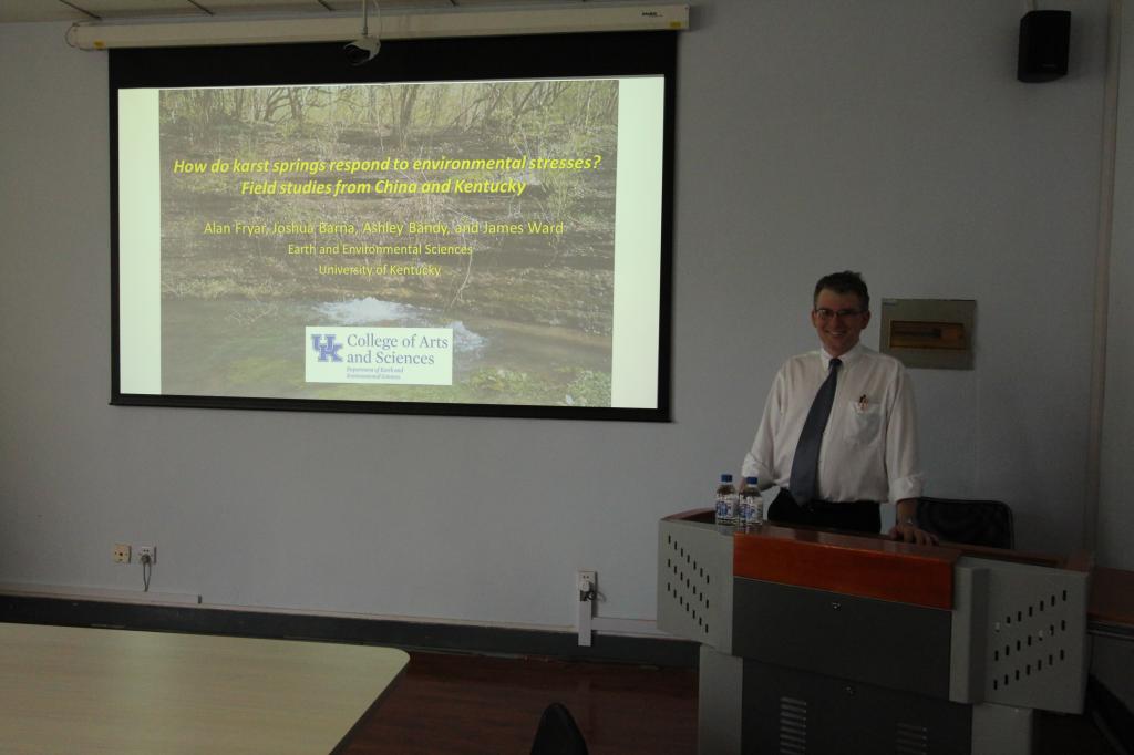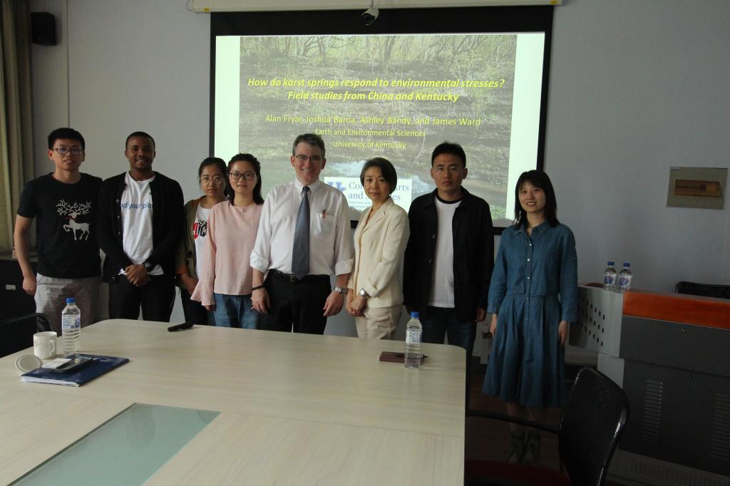 下午,Alan 教授与304永利集团师生作题为“How do Karst Spring Response to Environmental Stresses? Field Studies from China and Kentucky (中国与肯塔基典型岩溶泉对环境变化的影响机理)”学术报告。此学术报告由地下水科学与工程系李鸿雁教授主持,在报告会上,Alan 教授阐述了肯塔基州岩溶泉的特点及对环境变化的影响,并与贵州省岩溶泉的特点为例向师生们分享了对比差异。师生们对Alan教授的研究课题表示很感兴趣,并与Alan 教授就报告研究方向进行了深入探讨,收获颇丰。