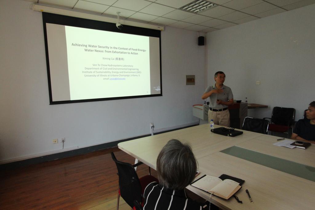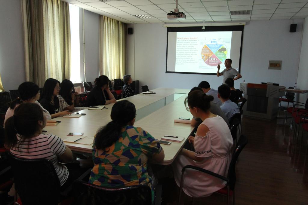 座谈会后, 蔡喜明教授与304永利集团师生作题为 “Achieving Water Security in the Context of Food-Energy -Water Nexus : from Exhortation to Action” 学术报告。此学术报告由地下水科学与工程系李鸿雁教授主持,在报告会上,蔡喜明教授阐述了水环境安全管理的相关研究,以全新的食物-能源-水环境科研体系为新能源与环境的师生拓宽了科研思维。师生们对蔡喜明教授的研究课题表示很感兴趣,并与蔡教授就水环境安全问题进行了深入探讨,收获颇丰。