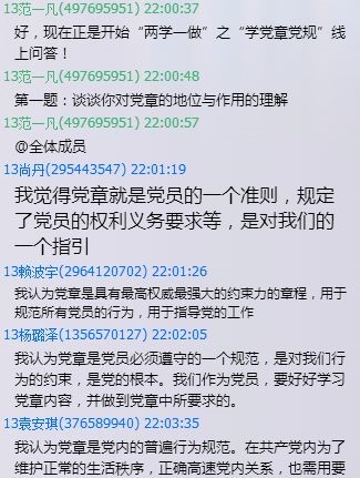 晚上10:00,支部员工党员在各自电脑旁做好答题准备。活动开始,由支部副书记提出问题,支部党员随后发言回答。本次问答活动以两学一做学习党章党纪为主题,设有谈谈你对党章的地位与作用的理解怎么理解党的纲领章程怎么理解两个先锋队10个问题,同学们踊跃发言,各抒己见。从大家的回答来看,都能对党章党纪有较好的理解。