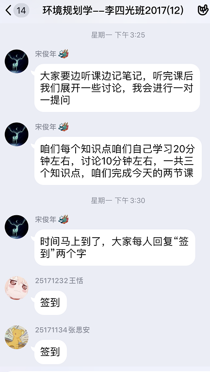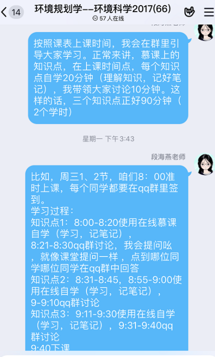 商讨后,确定按照教学计划,在教学课表规定的时间内采用“在线慕课+直播”的方式组织学习,即,针对每个知识点,先让员工在“中国大学慕课”平台上在规定时间内观看慕课进行学习;然后教师在规定的时间点通过qq发起群语音/视频通话,针对知识点进行补充讲解和提问,员工须在线上直接回答。一方面测验员工自学后对知识点的把握,便于教师补充,另一方面确保员工在这个时间段集中学习。由于现场提问,群内的其他同学同步收听,员工会认真学习和记笔记。