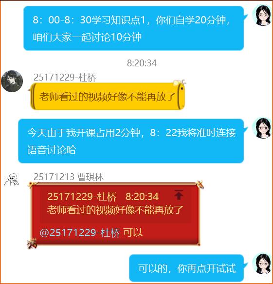 第二,上课时间到,教师准时发起群语音,说课2分钟,布置今天的学习任务,说明时间安排。员工在平台学习过程中,如果有问题,可以随时在群中询问老师,老师一直在线解答。