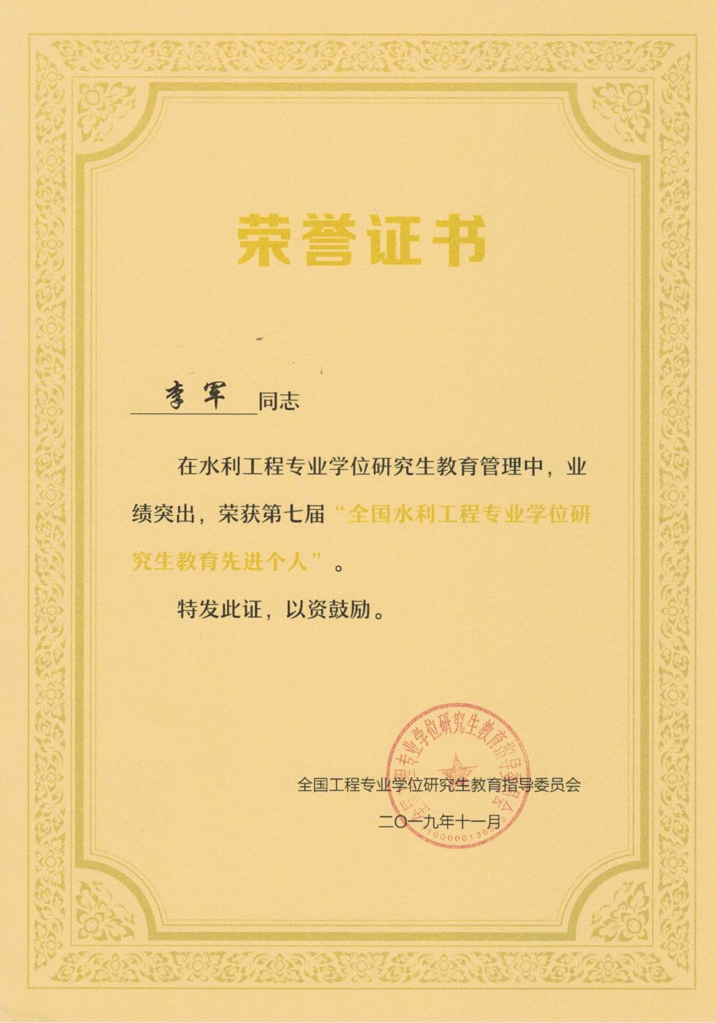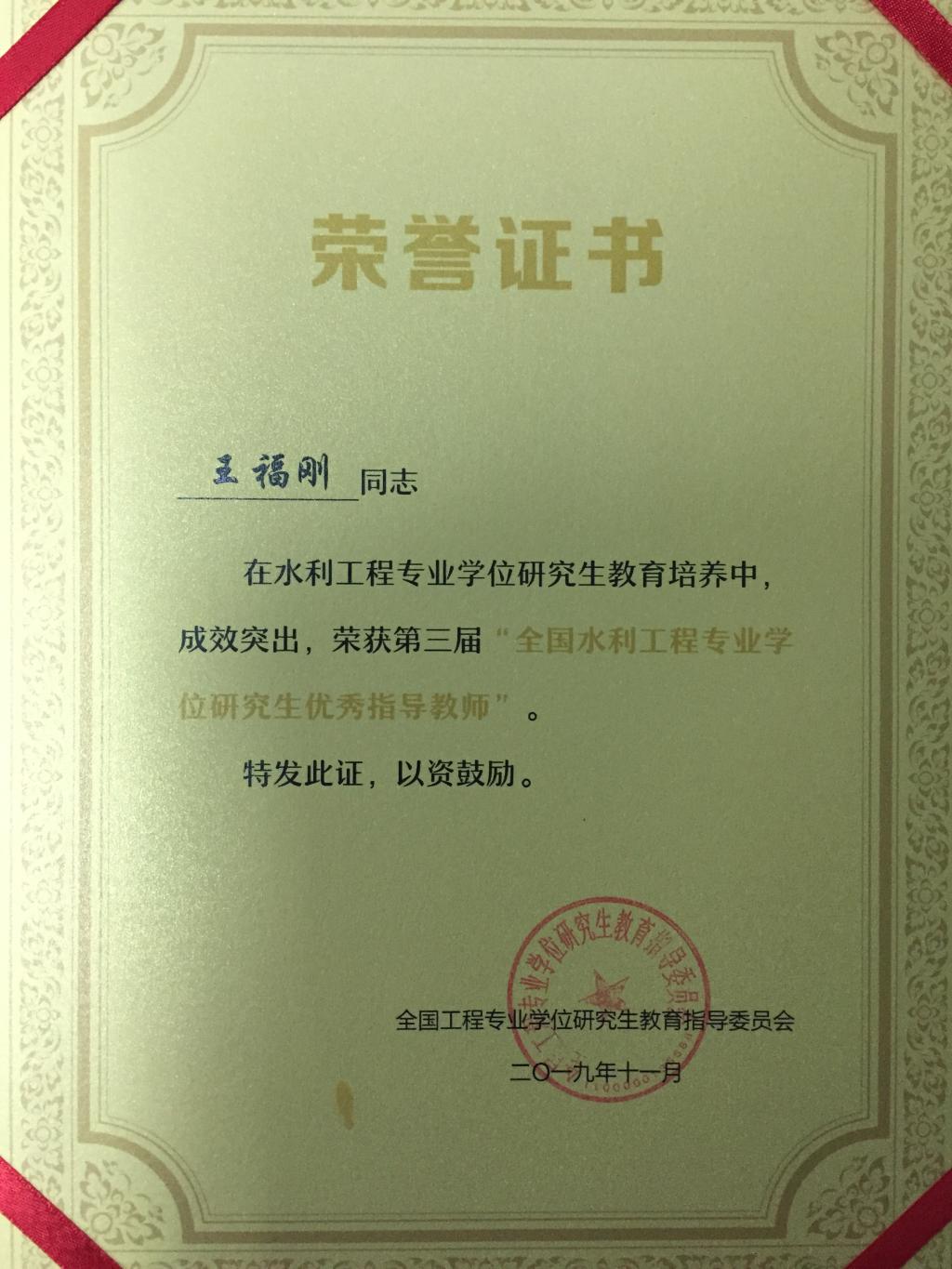 为更好地总结、交流水利工程专业学位研究生教育培养的工作和指导经验,促进水利工程专业学位研究生教育发展,提高导师指导能力,不断提高培养质量,经个人申请、单位推荐、水利工程领域核心组成员和专家投票、教指委审定,2019年共有18名指导教师被评为全国水利工程专业学位研究生优秀指导教师,14 名教工被评为全国水利工程专业学位研究生教育工作先进个人,其中公司王福刚教授获得 2019年“全国水利工程专业学位研究生优秀指导教师”荣誉称号,研究生办公室主任李军获得2019年 “全国水利工程专业学位研究生教育工作先进个人”荣誉称号。